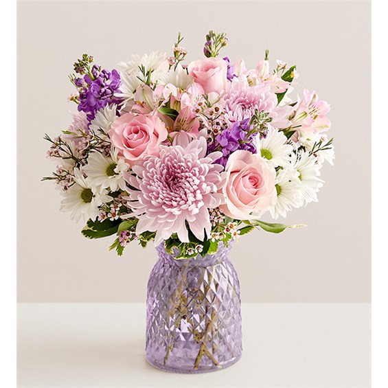 Inspired by the beauty of a blooming backyard garden, our bouquet is as amazing as Mom. Our florists arrange roses, Peruvian lilies, and other blooms in a lavender vase that accentuates the beauty of the pink petals.